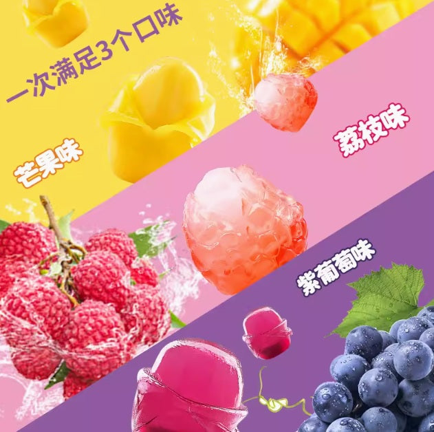 INGREDIENTES SABOR LICHIA: Xarope de maltose, água potável, açúcar branco, suco concentrado de lichia (≥50% com base no suco original), trealose cristalina, gelatina, sorbitol líquido, carragenina, ácido cítrico, ácido cítrico, goma, ácido DL-málico, dióxido de titânio, vermelho allura, cera de carnaúba, aroma alimentar.