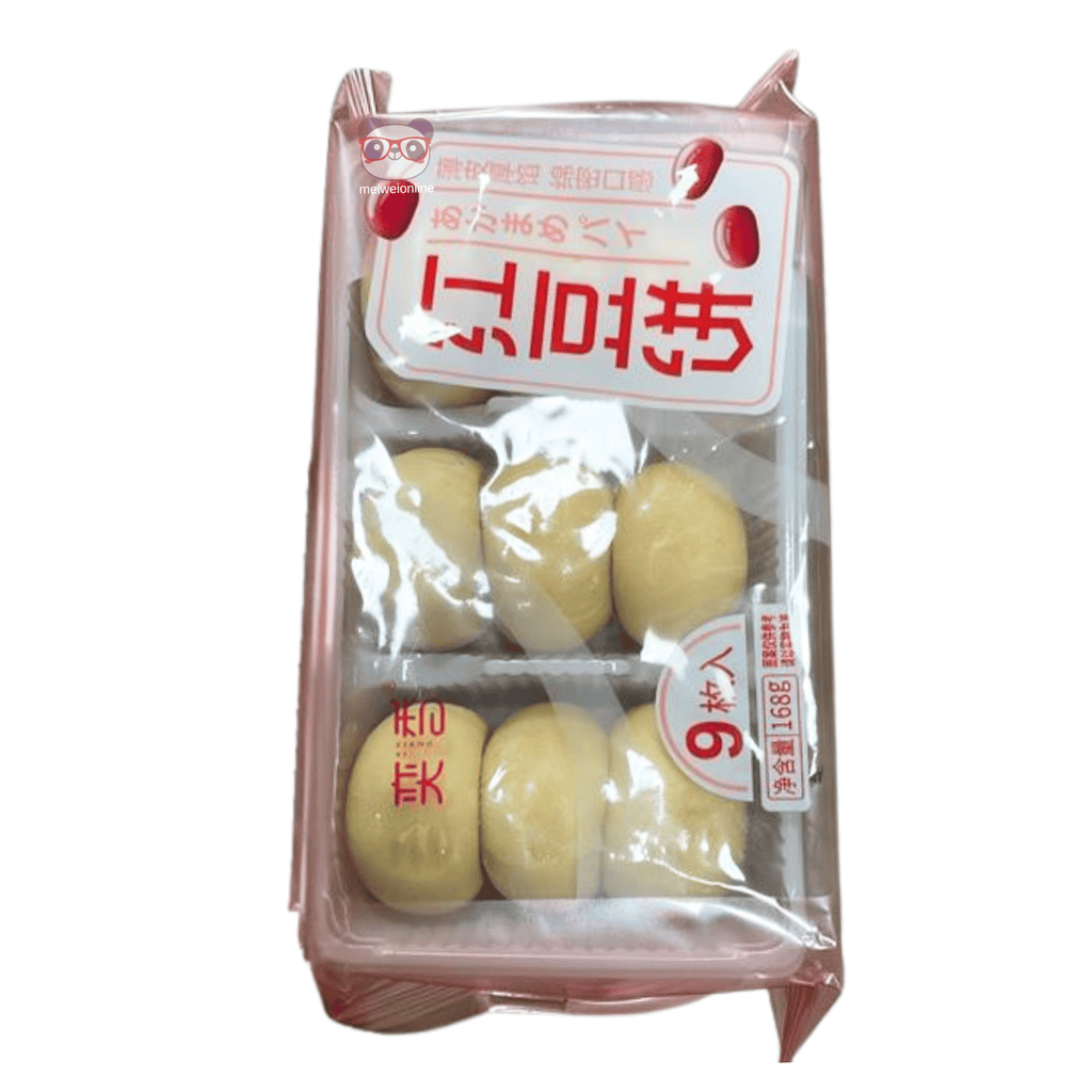 Cada pacote traz 9 unidades embaladas em bandeja, fofinhas, com massa branca macia e um toque de doçura do recheio de pasta de feijão vermelho (红豆沙).