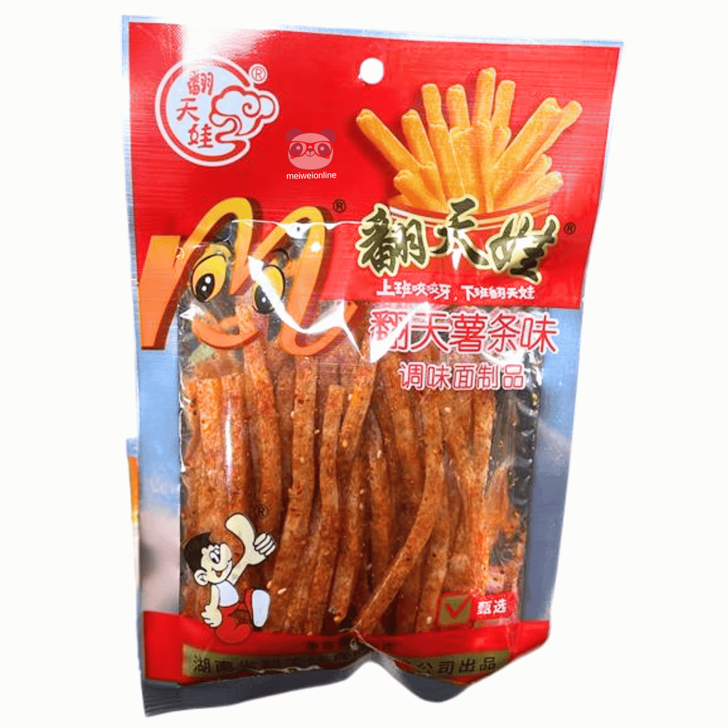 O Snack de Macarrão Crocante Sabor Batata Frita 翻天娃 彩天薯条味 调味面制品 é um petisco chinês feito à base de massa de trigo frita e temperada, em formato de palitinhos, lembrando batata frita crocante.