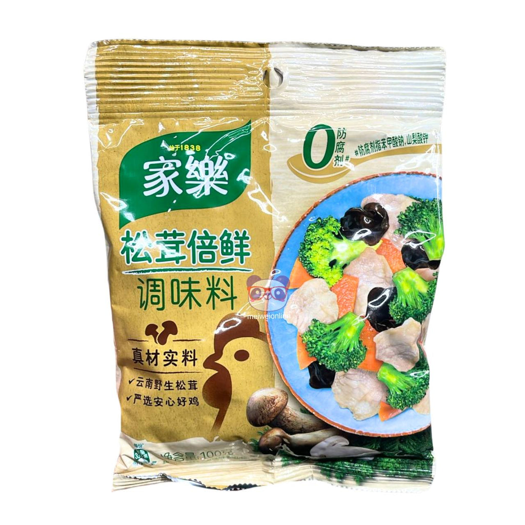 O Tempero Chinês de Frango com Cogumelo Matsutake Jiale 100g 家乐 松菇倍鲜调味料 é um mix de temperos em pó, típico das cozinhas chinesas, criado para deixar carnes, legumes e sopas muito mais aromáticos com o sabor combinado de frango e cogumelos (tipo matsutake).